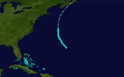 A ship known as Inflexible first encountered this storm over the central Atlantic to the east-southeast of Bermuda on September 1.[38] Moved northwestward, the cyclone became a hurricane on the following day. Turning northeastward,[7] the storm likely intensified further, based on several ship reports, including the steamship Taormina recording a barometric pressure of 963 mbar (28.4 inHg).[39] The Atlantic hurricane reanalysis project thus estimated that the cyclone became a Category 2 hurricane with maximum sustained winds of 105 mph (165 km/h),[5] while Fernández-Partagás and Diaz suggested that it may have strengthened into a major hurricane.[39] On September 4, the storm transitioned into an extratropical cyclone about halfway between Greenland and the Azores. Thereafter, the extratropical storm persisted until September 6, when it dissipated off the coast of Ireland.[7]