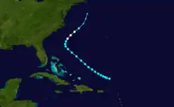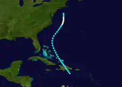As meteorologist Ivan Ray Tannehill in 1938 documented this storm as far back as September 29,[7]: 37 the official Atlantic hurricane database initiates the track on that date about 425 mi (685 km) northeast of Paramaribo, Suriname. Moving northeastward, the storm struck Dominica late on October 1 with winds estimated at 50 mph (85 km/h). The storm passed through the British Virgin Islands on the following day. After re-emerging into the Atlantic, the system curved north-northwestward on October 3 and then northeastward on October 4. As the cyclone neared Bermuda on October 5, it nearly became a hurricane, peaking with winds of 70 mph (110 km/h). On October 6, the storm was last noted approximately 270 mi (435 km) southeast of Sable Island, Nova Scotia.[6]