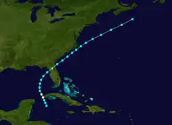 Maritime observations indicated the presence of a tropical storm over the northwestern Caribbean as early as June 15.[7]: 24 Moving north-northwestward, the cyclone struck the Guanahacabibes Peninsula of Cuba several hours later, likely as a minimal hurricane with sustained winds of 75 mph (120 km/h),[6] according to a study of wind damage conducted by meteorologist Ramón Pérez Suárez in 2000.[4] However, the hurricane weakened back to a tropical storm shortly after reaching the Gulf of Mexico on June 16. Gradually curving northeastward on June 17, the system made landfall near Cedar Key, Florida, with winds of 50 mph (85 km/h) around 14:00 UTC. After emerging into the Atlantic from the First Coast on the following day, the system remained closely offshore Georgia, South Carolina, and North Carolina. The cyclone was last noted on June 20 about 115 mi (185 km) southwest of Sable Island, Nova Scotia.[6]