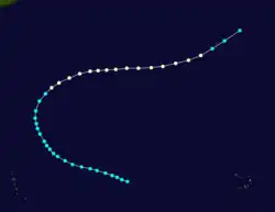 The 1924 report from Mitchell noted that this storm was first observed near the Cabo Verde Islands on September 12.[7]: 37 Initially moving northwestward, the storm curved north-northwestward two days later, but then resumed a northwestward course by September 16. The cyclone is estimated to have peaked with winds of 60 mph (95 km/h). By September 18, the system turned north-northeastward and was last noted on the following day about 290 mi (465 km) southeast of Cape Race, Newfoundland.[6] Chenoweth's study indicates that the cyclone developed as a tropical depression on September 14. An extratropical transition on September 19 has also been proposed.[5]