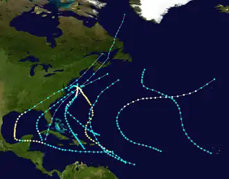 | Four | September 1–12 | Category 2 hurricane | 105 (165) | ≤981 | Lesser Antilles (Guadeloupe), Northeastern United States | >$2.36 million | 40 | [7]: 29 | ||