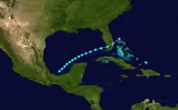 Meteorologist Ivan Ray Tannehill began the track for this storm in the northwest Caribbean on September 28 during his 1938 review of the season, which subsequent meteorologists such as José Fernández Partagás and Henry F. Diaz confirmed in their 1995 reanalysis.[6] The system moved west-northwestward and made landfall in the Yucatán Peninsula south of Tulum.[5] Due to trekking across the peninsula for several hours, the cyclone likely weakened to a tropical depression, but re-intensified into a tropical storm upon emerging into the Gulf of Mexico on September 29. Thereafter, the storm peaked with winds of 60 mph (95 km/h) as it curved northeastward and then almost due eastward by the following day. However, upon reaching the Straits of Florida late on October 1, the cyclone assumed an east-northeastward to northeastward motion while passing just south of the Florida Keys. By October 3, the storm moved northeastward towards the western Bahamas, crossing the Abaco Islands before reaching the open Atlantic. The cyclone moved ashore Newfoundland near the Burin Peninsula on October 7 and was last noted shortly thereafter.[5]