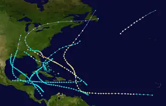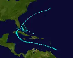 Ships first indicated the presence of a tropical storm southwest of Cabo Verde on September 5.[10] The system moved generally westward and intensified into a hurricane late the next day. Early on September 11, the storm peaked as a strong Category 2 hurricane with maximum sustained winds of 110 mph (175 km/h) as it began passing through the Lesser Antilles, first near Barbados and then between Saint Lucia and Saint Vincent several hours later. Thereafter, the hurricane turned northwestward and entered the Caribbean. Around 18:00 UTC on September 12, the cyclone passed just west of Anguilla while traversing the Anegada Passage and re-emerged into the Atlantic. The storm continued northwestward until curving northeastward on September 17. Late on September 19, the system transitioned into an extratropical cyclone about 95 mi (155 km) of the eastern tip of Nova Scotia. The remnants crossed Newfoundland before dissipating over the Labrador Sea on the following day.[3]