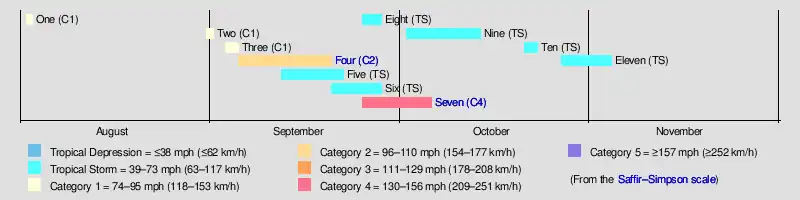 | Seven | September 25 – October 6 | Category 4 hurricane | 130 (215) | 938 | Southeastern United States (Georgia) | $1.5 million | 179 | [29][31] | ||