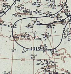 The system re-intensified into a hurricane at 1200 UTC on July 31. Further deepening occurred, with the storm becoming a Category 2 hurricane early on August 1. Later that day, the hurricane made landfall between Carrabelle and Eastpoint, Florida, with winds of 100 mph (155 km/h).[2] Reports at landfall indicate that the storm was small, spanning a diameter of only 40 miles (64 km).[1] At 18:00 UTC on August 1 – about an hour after it moved inland – a weather station measured the storm's minimum barometric pressure of 979 mbar (28.9 inHg).[3] Early on August 2, it weakened to a tropical storm and then a tropical depression several hours later. Shortly thereafter, it dissipating over southern Alabama.[2]