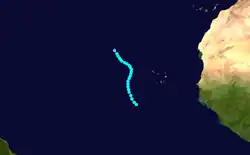 A tropical storm was first observed just east of Boa Vista in the Cape Verde Islands on August 25. The storm moved west-northwest and struck the island with winds of 40 mph (65 km/h) a few hours later. After reaching the open Atlantic, the system intensified and reached hurricane status early on August 27. Later that day, it peaked with maximum sustained winds of 80 mph (130 km/h),[4] an observation from the Norwegian barque Professor Johnson.[2] The hurricane began weakening early on August 28 and fell to tropical storm intensity shortly thereafter.[4] By late on August 30, the storm was analysed to have dissipated about 1,145 mi (1,845 km) northwest of Santo Antão in the Cape Verde Islands.[2]