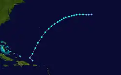 A tropical storm was first observed at 06:00 UTC on September 16, while located about 640 mi (1,030 km) southwest of Cape Verde, at the most southerly latitude of any North Atlantic tropical-storm-strength cyclone on record.[6] The storm headed west-northwestward for a few days and slowly strengthened. Late on September 19, it accelerated and began curving northwestward. At 00:00 UTC the next day, the storm strengthened into a Category 1 hurricane on the modern-day Saffir–Simpson hurricane wind scale. Later on September 20, the hurricane curved northward and then to the northeast. Further deepening occurred, with the storm becoming a Category 2 hurricane early the following day.[3]