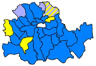 ![]() Results by Borough in 1906. (Blue indicates Municipal Reform, yellow indicates the Progressives and light blue indicates independent control) | ||||||||||||||||||||||