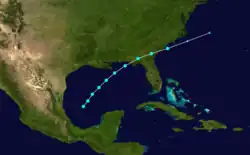 The system that would eventually develop into a tropical storm was first noted by a ship north-northwest of Veracruz on September 23.[9] It was recognized as a tropical storm on September 27 while it was located above the Bay of Campeche, and moved northeastward, and slowly accelerated as it intensified. By September 28, it was moving east-northeastward at 24 mph (39 km/h), and simultaneously attained its peak intensity of 50 mph (85 km/h). At this point, it remained just offshore the Florida panhandle, and moved inland shortly thereafter on September 29. It plowed through northern Florida and southeastern Georgia while maintaining its intensity and transitioned into an extratropical cyclone off the coast of North Carolina on September 29.[1] The remnants of the storm merged with a cold front the following day while situated south of New York.[10]