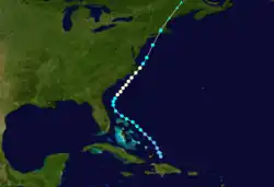 Historical weather maps indicate the presence of a tropical storm about 535 mi (860 km) east-northeast of Barbados on September 7.[1][5] Moving west-northwestward, the storm passed just north of the Lesser Antilles and slowly intensified, becoming a hurricane just offshore the Dominican Republic early on September 11. Thereafter, the cyclone strengthened more quickly, becoming a Category 2 hurricane just prior to striking Inagua in the Bahamas several hours later with winds of 100 mph (160 km/h). Around 12:00 UTC on September 12, the system strengthened into a Category 3 hurricane and peaked with maximum sustained winds of 120 mph (190 km/h) by early the following day. The storm curved northward and passed over or near several islands on September 13 and September 14, including Exuma, Cat Island, and Eleuthera. Later on September 14, the cyclone turned northeastward and exited the island chain. While traversing the open Atlantic, the system slowly weakened and remained a hurricane until falling to tropical storm intensity late on September 18 while just offshore Newfoundland. The storm soon struck the island and became extratropical near Port Rexton. The extratropical remnants continued northeastward and dissipated over the Labrador Sea late the following day.[1]