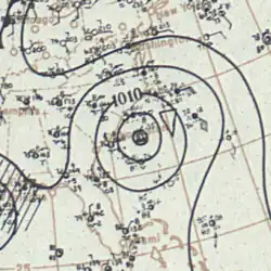 A ship first observed this tropical storm about 245 mi (395 km) north-northwest of Telchac Puerto, Yucatán, at 12:00 UTC on September 16.[1][5] The storm intensified gradually while moving northwestward, peaking with maximum sustained winds of 70 mph (115 km/h) at 00:00 UTC on September 18. However, the cyclone soon quickly weakened, falling to tropical depression intensity about 18 hours later. It then dissipated about 70 mi (115 km) south-southwest of the Texas–Louisiana state line.[1]