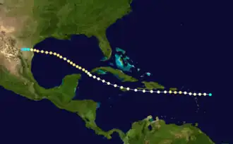 A tropical storm developed east of the Leeward Islands on September 5 and quickly became the season's first hurricane. It continued westward through the islands and is estimated to have attained winds corresponding to Category 2 status on the modern-day Saffir–Simpson Hurricane Scale.[5] On the night of September 6, San Zacarias Hurricane passed south of Puerto Rico; winds blew up to 72 mph (116 km/h) at San Juan.[8][9] The hurricane weakened somewhat on September 7 as it skirted the southern coast of Hispaniola, and curving northwestward, it passed along northern Jamaica. On September 10, it moved through the Yucatán Channel, restrengthening upon emerging into the Gulf of Mexico.[5] Now on a northwesterly course,[9] the storm reached its peak windspeeds on September 12.[5] Two days later, it made landfall along the Texas coast.[9]