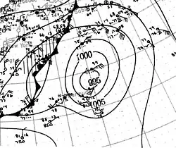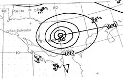 The final storm was first observed as a disturbance near Puerto Rico in the Caribbean Sea in late October.[17] The disturbance was the precursor to a tropical depression which developed over the southern Bahamas and headed west-southwestward across Cuba,[1] where, at Havana, winds blew from the southeast at 44 mph (71 km/h).[17] It became a tropical storm on October 27 and drifted southwestward. Near the eastern tip of the Yucatán Peninsula, the storm turned sharply northward.[1] An area of high pressure over the United States prevented the cyclone from turning eastward toward Florida, and it continued into the Gulf of Mexico. However, on October 31, the storm curved eastward and moved ashore over northern Florida. The storm decreased in intensity as it passed into the Atlantic.[17] The storm's circulation center remained poorly defined throughout its course. It was long believed to have developed south of Cuba, although a reevaluation of ship data indicated the depression had actually formed east of the island.[2] On October 26, the Weather Bureau hoisted hurricane warnings along the east coast of Florida from Key West to West Palm Beach, and on the west coast up to Tampa.[18]