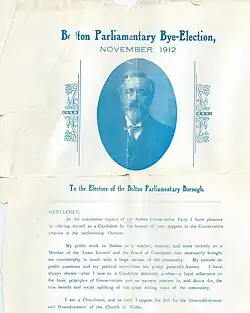 - The Unionists changed their candidate and fielded Arthur Brooks, who had not contested a parliamentary election before. He was a retired schoolmaster from nearby Burnley but had moved to Bolton and had been elected to Bolton Town Council.[3]