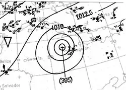 The origins of the 1912 Jamaica hurricane can be definitively traced to a low-pressure area first identified on November 10 in the central Caribbean Sea, south of Hispaniola. Although a tropical wave that crossed the Lesser Antilles several days prior was believed to be a possible precursor to the hurricane, this could not be fully concluded due to the lack of observations in the eastern Caribbean Sea.[2] Early on November 11, the development of a closed atmospheric circulation led to the classification of a tropical storm about 110 mi (180 km) north of Cacique, Colón, in Panama at 06:00 UTC that day.[3] Decreasing barometric pressures in the region confirmed the presence of a cohesive and developing system.[4] The tropical cyclone remained weak as it moved slowly northward, but gradually intensified into a Category 1 hurricane on the modern day Saffir–Simpson hurricane wind scale east of Nicaragua at 18:00 UTC on November 13.[3] A ship at or near the storm's center during that time documented a pressure of 992 mbar (hPa; 29.30 inHg).[4]