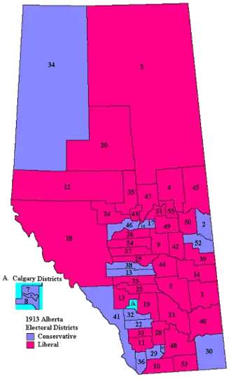 The 1913 Alberta general election was held in March 1913. The writ was dropped on 25 March 1913 and election day was held 17 April 1913 to elect 56 members to the 3rd Alberta Legislature. Elections in two northern districts took place on 30 July 1913 to compensate for the remote location of the riding. The method to elect members was under the First Past the Post voting system with the exception of the Edmonton district which returned two members under a plurality block vote. The election was unusual with the writ period for the general election being a very short period of 23 days.