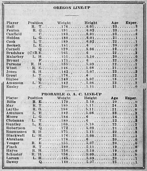 Roster for the November 8 rivalry game against the Oregon Agricultural College Aggies. This published roster from the Emerald is highly unusual for the era by including height, age, and experience.