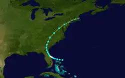 The first storm of the season developed quickly, beginning as a tropical storm early on July 31 about 70 mi (115 km) northeast of the Abaco Islands in the Bahamas. The storm reached hurricane intensity the following day as it approached Florida.[3] At 18:00 UTC on August 1, the small hurricane made landfall near Titusville, Florida, at peak strength with winds of 75 mph (120 km/h) and a minimum atmospheric pressure of 990 mbar (29 inHg).[2] It then weakened and curved towards the northeast, taking a track across the Appalachian Mountains as a tropical storm.[3] Slight reintensification occurred as it approached the Mid-Atlantic states, perhaps aided by baroclinic influences. Late on August 4, the system became extratropical upon merging with a frontal boundary,[2] and later dissipated the following day.[3]