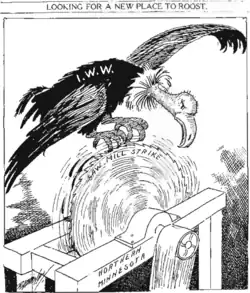 During the strike, union organizers from the Industrial Workers of the World (IWW) helped to organize the miners.[1] The IWW, whose members are known as Wobblies, had been established in Chicago in 1905 at a meeting of socialists and miners from the Western United States.[1][7] The organization was a radical anti-capitalist union that advocated for industrial unionism and the concept of the One Big Union.[1][7] Over the next decade, the union had established a presence in Minnesota, organizing a local union of lumberjacks in Deer River in 1910 and participating in free speech fights in Duluth and Minneapolis in the early 1910s.[7] However, the miners' dispute had caught the union off guard.[1] Despite this, shortly after it began, the IWW established a local union in Virginia, a city of slightly over 10,000 people on the range,[1] and helped the miners to coordinate strike actions and write a list of demands to the mining companies.[6] The local union, Metal Mine Workers' Industrial Union No. 490, was based out of the Finnish Socialist Hall, a meeting hall for socialists among Virginia's community of Finnish immigrants.[8] Many Finns in the area had been involved in the strike and were supportive of socialist ideals and the IWW in particular, and socialist halls such as the one in Virginia existed in many of the towns along the Mesabi Range, serving as centers for community life.[8] During this time, Local 490 established many branches in cities throughout the range.[7] Following the end of the strike, Local 490 remained as the largest IWW organization in northern Minnesota, with about 2,000 of the 10,000 to 15,000 miners who participated in the strike remaining members.[1] The local union was led by secretary-treasurer Charles Jacobson, a long-time native of Virginia who worked as a miner.[1]