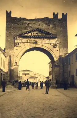 Rimini's city centre was considered unsafe by the number of unstable structures, and many roads were guarded by soldiers with instructions not to allow pedestrians through. Several merlons of the Arch of Augustus fell,[5] as they also had after the 17 May earthquake.[15] In September 1921, it was estimated that the restoration work on Rimini's municipal hall, whose redesign was entrusted to architect Gaspare Rastelli, amounted to 630,000 lire.[8] Among the earthquakes' few positives, they caused eighteenth-century plaster in the apse of the Church of Sant'Agostino to collapse, revealing forgotten fourteenth-century frescos.[22]