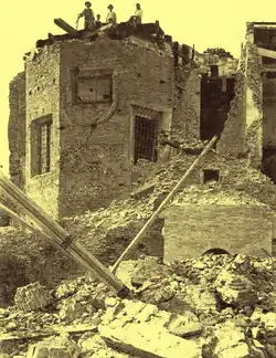 80% of Riccione was razed.[4] Among the destroyed buildings were the ancient Church of San Lorenzo in Strada and the Ceccarini kindergarten, which were rebuilt, and the Amanti-Martinelli Marine Hospice, which was replaced with the Grand Hotel. Damaged buildings included the Ceccarini Hospital, the Hotel des Bains, the Villa Graziani, the Villa Pullè, and the Fontanelle and Trinità towers.[4][23] Engineers noted that the Hotel des Bains had insufficiently thick walls for its height, and that buildings in the Fontanelle area had been shoddily built using rounded pebbles bound with low-quality lime.[8]