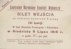 The German occupation authorities ultimately rejected the Warsaw Citizens Committee April 1916 draft electoral ordinance, and instead opted for an electoral ordinance based on the Prussian system of separate and unequal curiae.[1] On May 28, 1916, the German occupation authorities issued a bulletin with the provisions for the election of the Warsaw City Council.[9] The electoral regulation mixed a system of curiae with proportional election (except in the Third Curia).[9] The new City Council would have 90 seats.[9] Candidates had to be men over the age of 30 years, with "spotless moral and political reputation" and fluent Polish language skills.[9][4] Voting rights were given to men aged over 25 years.[9][4] Moreover, a small number of wealthy and educated women were given the right to vote, albeit only through a male proxy.[9][4] The German authorities divided the voters into six curiae, with each of the curiae being allotted 15 seats in the City Council.[4] On June 4, 1916, Warsaw residents began entering their names in electoral rolls of the six curiae.[6] Initially interest in the election was low, but the electoral campaign soon captured the attention of the city.[6] All in all by late June 1916, there were a total of 82,223 registered voters.[10]