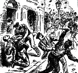 In January, violence broke out in Glasgow over a perception that black sailors were "being given the preference in signing on for a ship about to sail", and the belief that they would accept lower wages to do so.[4] Thirty African sailors were chased through the streets of Glasgow by a crowd of hundreds,[5] with the Dundee Evening Telegraph reporting that one black sailor had shot and injured a white seaman, one of three injuries sustained during the riot.[4]