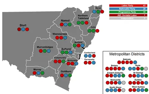 The assembly was evenly divided, with Labor having 43 seats and the support of Percy Brookfield (Socialist Labor) and Arthur Gardiner (Independent Labor), while the Nationalists had 28 seats and the support of 15 seats of the Progressive Party and 2 independent Nationalists.[2][3][4] The Speaker of the Legislative Assembly did not vote unless there was a tie which meant whichever side provided the speaker was unable to command a majority. Nationalist Daniel Levy controversially accepted re-election as speaker, giving Labor an effective majority.[5][6]