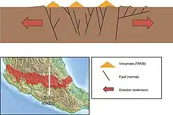 Volcanism usually occurs directly above slabs that undergo metamorphism at around 100 km (60 mi) depth. In southern Mexico, the slab reaches this depth 300 km (200 mi) from the trench.[6] Beneath land, the Cocos plate generates earthquakes at 60–100 km (40–60 mi) depth, but these cease abruptly some 100 km (60 mi) south of the TMVB.[8] North of where the intraslab seismicity ceases are shallow intraplate earthquakes within the TMVB. Crustal deformation in the TMVB is characterized by extension[a] which occurs perpendicular to the general strike of the TMVB.[8][9] East–west striking normal faults form because of extension; some of these fault scarps are mapped for up to 50 km (30 mi).[10][11] These faults move at an average rate of 2 mm (0.079 in) per year and because of their active state, they can produce earthquakes.[11]