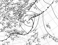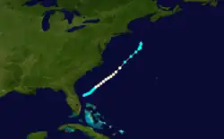 A northeast-southwest oriented trough developed into a tropical depression about 870 mi (1,400 km) east-southeast of Barbados early on September 13.[3] Initially moving west-northwestward, the depression intensified into a tropical storm several hours later, before curving northwestward the next day.[6] The French S. S. Mont Rose was the first ship to encounter the storm, then centered about 200 mi (320 km) east of Martinique on September 15.[3] Thereafter, the cyclone strengthened significantly, becoming a hurricane around 12:00 UTC and then reaching major hurricane intensity by 06:00 UTC on September 16.[6] The cyclone strengthened slightly over the next few days, with sustained winds peaking at 120 mph (190 km/h) on September 17. By later that day, the system curved northward while centered north of the Mona Passage. Early on September 20, the hurricane began moving north-northeastward.[6] Around 12:00 UTC on September 21, the hurricane passed almost directly over Bermuda while still at major hurricane intensity.[6] The storm began accelerating and weakening later on September 21. By 00:00 UTC on September 23, the system became extratropical about 510 mi (820 km) south of Cape Race, Newfoundland. The remnants slowly weakened while approaching the British Isles, before dissipating over the English Channel on September 28.[6]