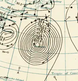 Historical weather maps suggest that a tropical depression developed about 85 mi (135 km) north-northwest of Barranquilla, Colombia, early on October 11. The depression moved slowly westward and then northwestward without significant intensification for a few days. By October 15, the depression had reached tropical storm status. Late on October 16, the cyclone began intensifying at a quicker pace, becoming the equivalent of a modern-day Category 2 hurricane on October 17. Around 00:00 UTC the next day, it peaked with maximum sustained winds of 110 mph (180 km/h).[6] Early on October 18, a ship reported a minimum pressure of 984 mbar (29.1 inHg) near the center, the lowest pressure measured during the life span of the storm.[3]
