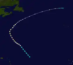 A tropical storm developed from a tropical wave over the deep tropics of the Atlantic Ocean on August 18.[4] Moving west-northwestward, it intensified into a Category 1 hurricane on the modern day Saffir–Simpson hurricane wind scale by August 19. The storm deepened significantly over the next few days, and by August 22, it peaked as a Category 3 hurricane with sustained winds of 125 mph (205 km/h) and a minimum pressure of 950 mbar (28 inHg).[5] The latter was observed by the S.S. Maraval, while the former was estimated using the pressure-wind relationship.[4] Around that time, the system began curving northwestward and later northward. By August 23, it turned to the north-northeast and then began weakening on August 24. Thereafter, the storm accelerated toward Atlantic Canada. Late on August 24, the hurricane struck near Yarmouth, Nova Scotia, as a Category 2 hurricane, just before becoming extratropical. The remnants continued northeastward, striking Newfoundland and later Iceland, before dissipating near Jan Mayen on August 29.[5]