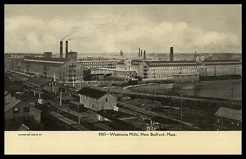 While the Wamsutta Mills, established in 1846, predated the turn of the local economy from whaling to textile making, between 1880 and the coming of World War I the pioneer firm had been joined by another 32 companies, valued at a massive $100 million and employing 30,000 people.[6] The industry prospered and New Bedford boomed in the four decades after 1880, growing in population from 40,000 to more than 120,000.[7]