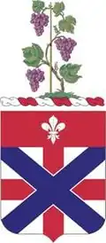The unit insignia is a Silver color metal and enamel device 1+1⁄8 inches (2.9 cm) in height, consisting of a shield emblazoned with an argent, a cross Gules, overall a saltire Azure, that portion of the saltire upon the cross fimbriated of the field; on a chief of the second, a fleur-de-lis of the first. Attached below the shield is a red scroll inscribed "Skill and Force" in Silver letters.