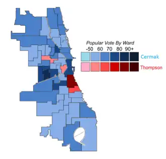 Cermak carried 45 wards, while Thompson carried five.[8] The five wards that Thompson carried all had sizable black populations.[8]
