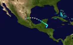 The first storm of the season formed on May 14 in the southwestern Caribbean Sea off the east coast of Nicaragua. It moved quickly to the north-northwest, passing just northeast of the eastern tip of Honduras. On May 15, the storm turned to the west and entered the Gulf of Mexico while moving around the Yucatán Peninsula. The next day, it attained peak winds of 50 mph (80 km/h), based on a ship report. Turning southward, the storm made landfall on Ciudad del Carmen in Mexico early on May 19 with winds of 40 mph (64 km/h). It dissipated over land later that day.[11]