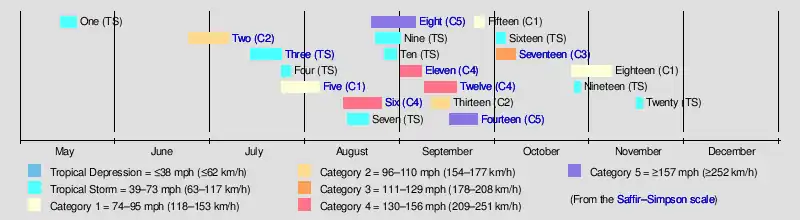 | Eight | August 22–September 5 | Category 5 hurricane | 160 (260) | 930 | Turks and Caicos, Cuba, Florida Keys, Texas | $27.9 million | 179 | |||
