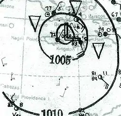 Parts of eastern Jamaica began to experience strong northeasterly winds early on October 20, and the parishes of Saint Thomas, Portland, and Saint Mary ultimately bore the brunt of the storm.[3] Heavy rainfall swelled rivers and triggered landslides;[5] the ensuing floods destroyed bridges, inundated many homes, and necessitated the rescue of trapped individuals.[6] With telegraph communications cut to the hardest-hit areas and roads left impassable, the degree of destruction was initially uncertain, though it was described as "extensive".[7][8] The storm took a heavy toll on agriculture (already compromised from the effects of another hurricane less than a month earlier), with banana plantations in particular sustaining heavy damage.[3][7] Losses to fruit crops in the nation totaled an estimated $2,500,000.[9]