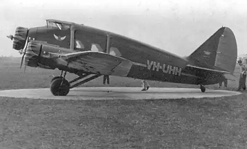2. ^ One month later, on 27 March 1937 at 5.30 am near the Archerfield aerodrome, VH-UGG crashed en route to Townsville, killing the pilot and one other person. (The Northern Herald (Cairns, Qld), 22 May 1937, p. 19, http://nla.gov.au/nla.news-article150554969 Archived 19 May 2022 at the Wayback Machine) This occurred in fog, and a failure of the right engine was later noted.