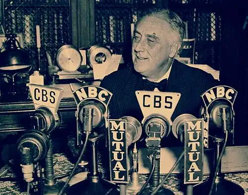 The Republican state convention met on September 29 and nominated Dewey unanimously.[9] In his acceptance speech, Dewey called for a new progressive Republican movement in the vein of former governors Theodore Roosevelt and Charles Evans Hughes and criticized obstructionism within his own party. Avoiding referencing Lehman, who had not yet agreed to run, by name, he charged, "any Democratic governor is, perforce, the good-will advertising, the front man, the window dressing for what is, in part at least, a thoroughly corrupt machine."[10] Radio reports of his speech were interrupted by news of the Munich Agreement.[11]