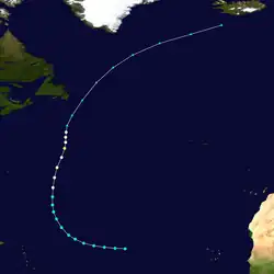 The ninth storm of the season formed early on September 21, via a tropical wave that departed the western coast of Africa several days prior.[2][10] The cyclone only slowly organized as it tracked west-northwest and then north, attaining hurricane strength early on September 24. After reaching its peak as a Category 2 hurricane with maximum sustained winds of 100 mph (160 km/h) around 12:00 UTC the next day, an approaching cold front prompted the beginning of extratropical transition. The hurricane became extratropical on September 26, well south of Newfoundland. The post-tropical cyclone curved northeast over the far northern Atlantic and was last noted south of Iceland two days later.[2]
