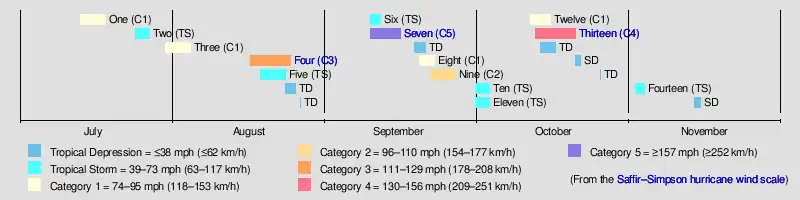 Tropical cyclogenesis is believed to have begun with Hurricane One on July 13. Two other tropical cyclones formed in July.[2] Four systems developed in August, two tropical depressions, a tropical storm, and a hurricane – the Jamaica hurricane. The month of September featured the most activity, which included a tropical depression, three tropical storms, and three hurricanes. One of the hurricanes, the Great Atlantic hurricane, became the most intense tropical cyclone of the season, peaking with maximum sustained winds of 160 mph (260 km/h) and a minimum barometric pressure of 918 mbar (27.1 inHg). During October, a subtropical depression, two tropical depressions, and two hurricanes developed. November featured a tropical storm and a subtropical depression, the latter of which was absorbed by a frontal system on November 14, marking the conclusion of cyclonic activity for the season.[10]
