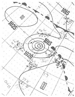 - ^ a b c d e Sumner, H. C. (September 1944). Woolward, Edgar W. (ed.). "The North Atlantic Hurricane Of September 8–14, 1944" (PDF). Monthly Weather Review. 72 (9). Washington, D.C.: American Meteorological Society: 187–189. Bibcode:1944MWRv...72..187S. doi:10.1175/1520-0493(1944)072<0187:TNAHOS>2.0.CO;2. Archived from the original (PDF) on March 3, 2017. Retrieved March 8, 2021.