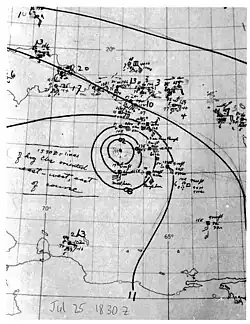 A tropical wave was noted near Grenada on July 11;[6] it organized into the season's first tropical depression two days later around 06:00 UTC while situated near Navidad Bank in the Turks and Caicos Islands.[2] Upon designation, the Weather Bureau planned reconnaissance flights for the first time ever to fly into a newly formed cyclone.[6] It intensified as it moved northwest, attaining tropical storm intensity by 00:00 UTC on July 14 and further strengthening into the season's first hurricane around 06:00 UTC on July 16. After reaching peak winds of 80 mph (130 km/h),[2] the hurricane recurved toward the northeast and began to weaken, though Bermuda reported winds near 40 mph (64 km/h) upon the storm's closest approach.[6] It transitioned into an extratropical cyclone around 00:00 UTC on July 19 and continued into the northern Atlantic, where it was absorbed by a larger extratropical low southeast of Newfoundland the next day.[2][10]
