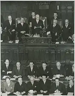 President Einaudi contained also several references to the international affiliation of the newborn Italian Republic: "Twenty years of dictatorial rule had proclaimed civil unrest, external war, and such material and moral destruction to the Fatherland that every hope of redemption seemed vain. Instead, after having saved, despite the regional and local differences and painfully mutilated, the indestructible national unity from the Alps to Sicily, we are now tenaciously reconstructing the destroyed material fortunes and we have twice given the world admirable proof of our will to return to free democratic political competitions and our ability to cooperate, equal among equals, in the forums in which we want to rebuild that Europe from which so much light of thought and humanity came into the world".[4]