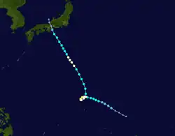 Faye was one of two storms that had its origin in the upper air, between 25 and 40 thousand feet, and gradually descended to the surface over the western edge of the Pacific high cell(indications of Kwajalein's upper winds verified the presence of an upper air low, and five days later its nearness to Iwo Jima was reflected on the surface) Faye, a moderate storm moved near and to the south of Iwo Jima and recurved around the Pacific high cell, 500 miles to the west of Iwo Jima. Faye followed a northerly path and passed over the western edge of Kyushu into the Japanese Sea.[7]