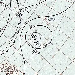 Tropical Cyclone Lise was first detected as a weak tropical low passing north of Guam and Saipan on 31 August, Navy Reconnaissance two days later established that this low had increased to typhoon intensity. Intensification is attributed to the low moving into a stagnant low pressure area in tho Philippine Sea. Lise began a sharp recurvature on 2 September and passed 70 miles southeast of Iwo Jima as an intense typhoon on 4 September. Maximum winds of 85 knots were experienced at Iwo Jima for a short period.[13]