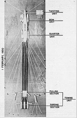 Originally, the weight-reduction phase had included removing the anchors from the battleship, but Wallin ordered one to be reattached to help shift Missouri's center of gravity forward to a narrower part of the battleship, thereby reducing the friction at her widest point.[18] During this time, the Bureau of Ships offered valuable technical and salvage advice to both the civilian and military participants in the salvage effort.[25]