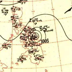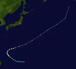 A disturbance was first noted in the vicinity of Micronesia on June 17 approximately 400 km (250 mi) south of Guam. Aircraft traversing between Guam and the Philippines eventually confirmed the presence of a developing tropical depression by June 25, tracking towards the west.[7] By the following day, the system had strengthened into a tropical storm. The system curved towards the north by June 28 and had begun to trend towards the northeast thereafter, gradually strengthening to a typhoon by 18:00 UTC that day. The storm continued to accelerate towards the northeast, passing just east of the Ryukyu Islands on June 30 before reaching peak intensity offshore Kyushu with maximum sustained winds of 185 km/h (115 mph) and a central pressure estimated at 975 mbar (975 hPa; 28.8 inHg). Kate weakened slightly before making landfall the following day on Shikoku with winds of 170 km/h (110 mph).[16] The typhoon curved eastward and continued to weaken, tracking through Sagami Bay and emerging over the Pacific Ocean on July 2 as a tropical storm.[7][16] Kate transitioned into an extratropical cyclone and would later dissipate the following day.[17]