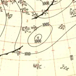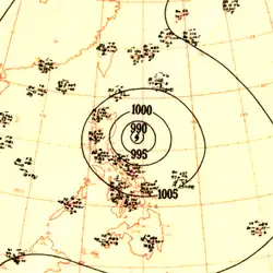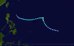 In late April, a well-developed tropical wave began developing east of Chuuk Lagoon.[9] Tracking westward, the easterly wave was analyzed to have organized into a tropical depression by 0000 UTC on April 29.[10] Twelve hours later, Iris was estimated to have strengthened into a tropical storm.[11] At roughly the same time, a vessel in the vicinity of the storm reported winds in excess of 65 km/h (40 mph), prompting the Guam Fleet Weather Center to initiate reconnaissance flights into the cyclone.[7] Midday on April 30, Iris intensified into the equivalent of a modern-day typhoon as it moved in a slightly oscillatory path towards the Philippines.[7][11] After a slight fluctuation in intensity during the overnight hours of May 1, Iris rapidly intensified to reach its peak intensity with a minimum pressure of 909 mbar (909 hPa; 26.8 inHg) and maximum sustained winds of 280 km/h (170 mph) early on May 4,[11] making it the equivalent of a Category 5 super typhoon;[10] at the time this was the first confirmed instance of a typhoon reaching such intensities.[2] Afterwards, Iris weakened slightly before making landfall on South Luzon around 1800 UTC the following day.[11]